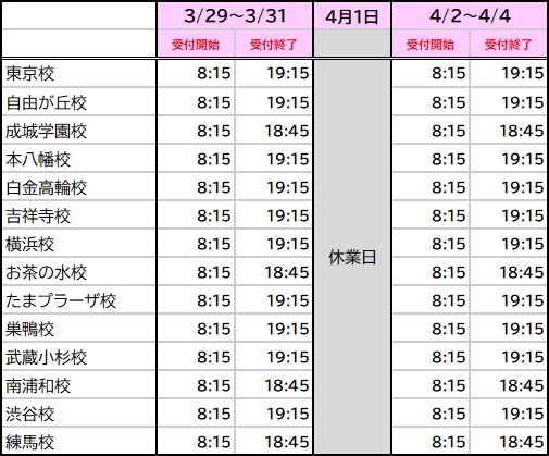 3/29~4/4は春期講習期間につき、受付時間が変更になります。併せて、講習前後期間の授業・受付時間につきまして、以下をご確認ください。